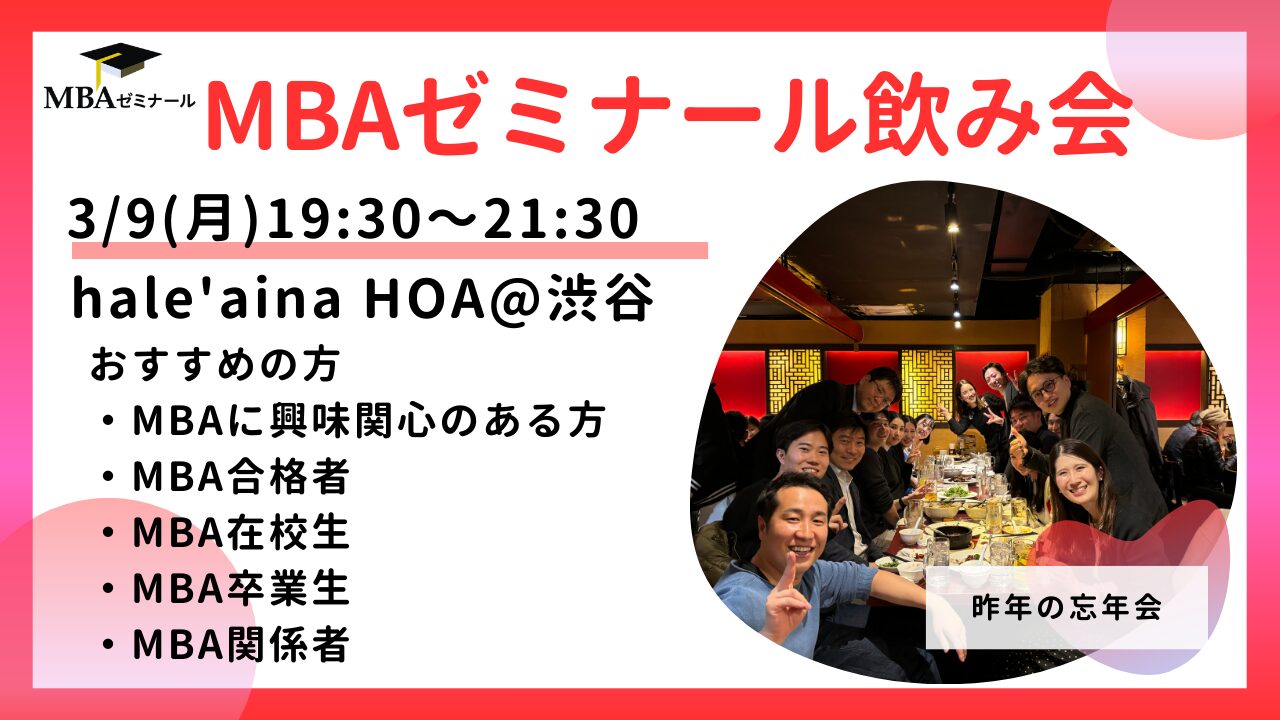 この度以下の概要にて、MBAに通われている方、通っていた方、興味関心のある方を中心とした飲み会を開催させていただくこととなりました。MBAゼミナールに通っていた方が中心になりますが、通われていない方も参加予定ですのでお気軽にお越しくださいませ。
